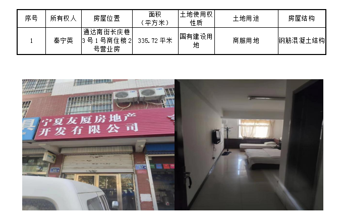 該戶債權(quán)項(xiàng)下抵押物位于通達(dá)南街長(zhǎng)慶巷3號(hào)1號(hào)商住樓2號(hào)營(yíng)業(yè)房,所在層數(shù)為-1至2層,總高8層,建筑面積335.72平米,2006年12月竣工。可作為辦公、旅館或者培訓(xùn)教育。